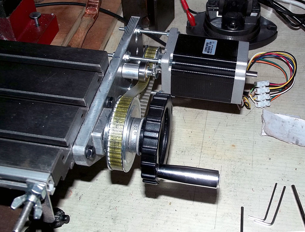 Pour l'axe X, le moteur est un Nema23 en 32kg/cm. Poulies de 20 et 40 dents. (photo 1)