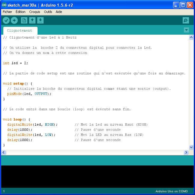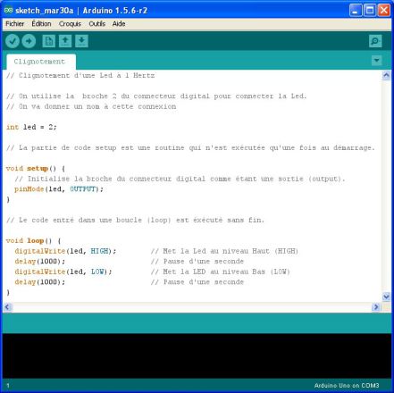 Aprés transfert du code dans la mémoire de l'Arduino (bouton téléverser), votre Led clignote à 1 Hertz.