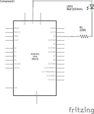 Nous allons connecter la cathode de la diode (patte la plus courte) à la résistance et celle ci en broche 2 du connecteur d'entrées/sorties digital de l'Arduino.