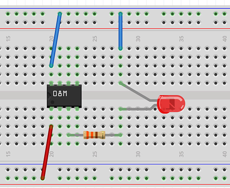 Pour cet exemple, nous aurons besoin d'un Picaxe 08M2, d'une diode led, et d'une résistance de 330 Ohms (orange, orange, marron)