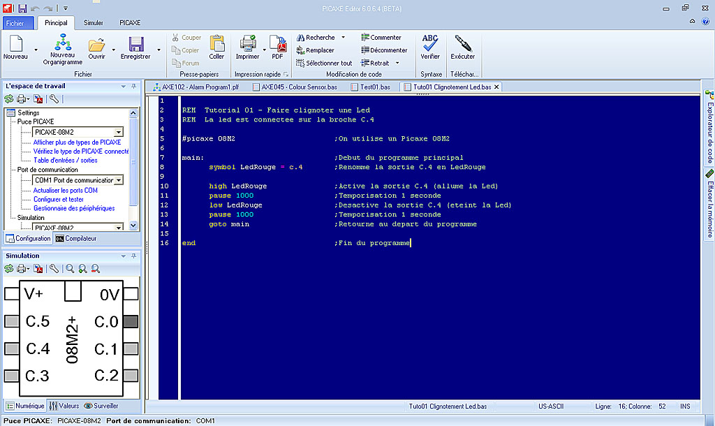 Aprés transfert du code dans la mémoire duPicaxe (bouton éxécuter), votre Led clignote à 1 Hertz.